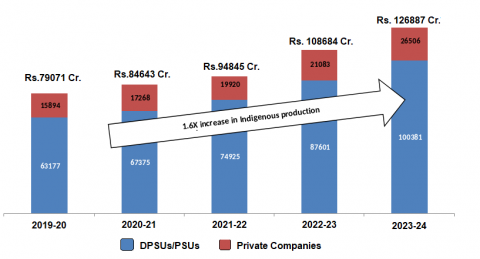 In the last five years (since 2019-20), the value of defense production has been increasing steadily, and grown by over 60%.